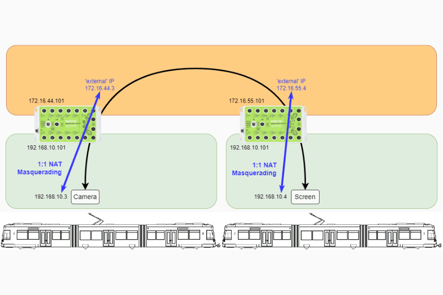 The train-wide IP network is used for communication across the train composition and the internal wagon IP network for communication within the wagon sections. By having two different subnets, the individual wagon parts can use identical IP addresses without causing an IP address conflict. For the workshop, this results in significant advantages during installation and maintenance.