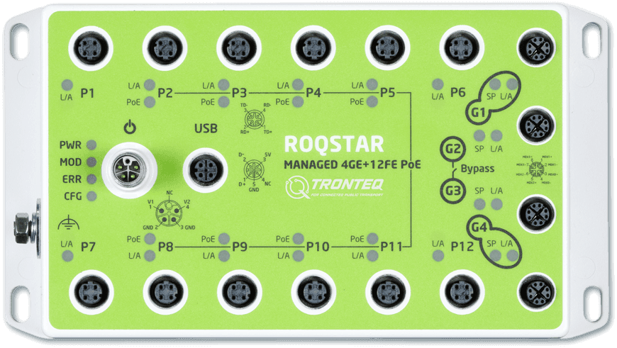The ROQSTAR 4GE + 12FE M12 Managed Gigabit Switch was specially developed for applications in buses and trams. The management functions of this Layer 2 switch enable, among other things, network segmentation and monitoring. An easy-to-use web interface and a USB port are available for switch configuration. Furthermore, there is the option of partially automated configuration distribution within an IP network. The integrated NAT function (Layer 3) allows this switch to forward data traffic to different subnets. The integrated PoE power supply delivers up to 96W at 24 VDC to 8 Ethernet ports. A bypass relay ensures that data traffic is maintained in the event of a switch failure in the network. Housed in a metal housing, the M12 connectors ensure stable data transmission despite shock and vibrations that prevail in buses and rail vehicles.