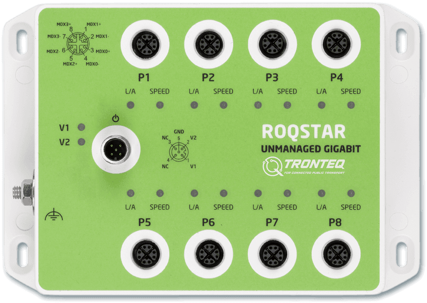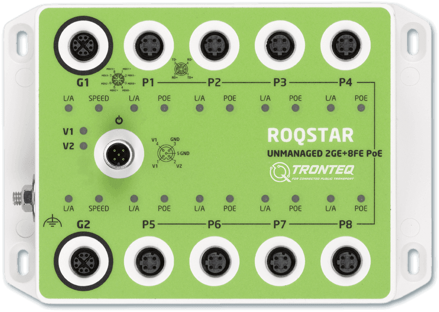 The ROQSTAR 10-Port M12 Unmanaged Gigabit Switch is ideal for implementing a Gigabit backbone in buses and trams. The switch has 10 M12 Gigabit Ethernet ports that are x-coded. Housed in a metal enclosure, the M12 connectors ensure stable data transmission despite the shock and vibration encountered in buses and rail vehicles. The switch is operated with 24 VDC on-board power supply. This ROQSTAR switch is ready for operation in less than two seconds.