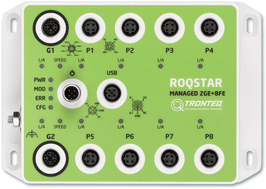 The ROQSTAR 10 Port M12 Managed Gigabit Switch was specially developed for applications in buses and trams. The Layer 2 switch has management functions that enable network segmentation and monitoring, among other things. The switch is configured via an easy-to-use web interface and USB connection. Furthermore, there is the option of partially automated configuration distribution within an IP network. The integrated NAT function (Layer 3) allows this switch to forward data traffic to different subnets. Housed in a metal housing, the M12 connectors ensure stable data transmission despite the shock and vibrations that prevail in buses and rail vehicles.