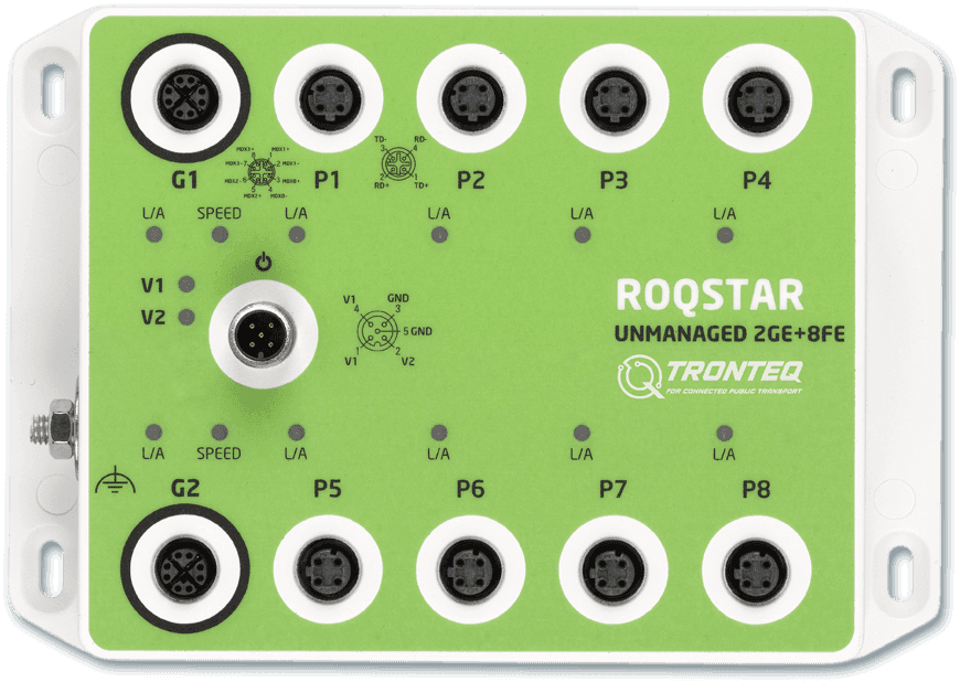 The ROQSTAR 2GE+8FE M12 Unmanaged Gigabit Switch is ideal for implementing a Gigabit backbone in buses and trams. The switch has 2 M12 Gigabit Ethernet ports that are x-coded and 8 d-coded M12 Fast Ethernet ports. Housed in a metal enclosure, the M12 connectors ensure stable data transmission despite the shock and vibration encountered in buses and rail vehicles. This ROQSTAR switch is ready for operation in less than two seconds.
