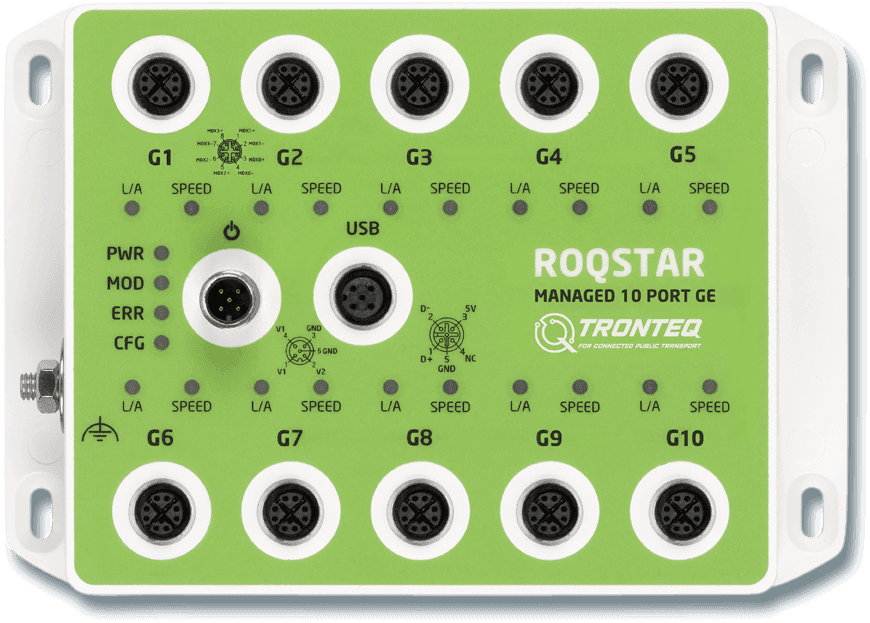 Der ROQSTAR 10 Port M12 Managed Gigabit Switch wurde speziell für Anwendungen in Bussen und Straßenbahnen entwickelt. Der Layer-2-Switch verfügt über Managementfunktionen, die u.a. eine Netzwerksegmentierung und -überwachung ermöglichen. Die Switch-Konfiguration erfolgt über ein einfach zu bedienendes Webinterface sowie per USB-Anschluss. Des Weiteren besteht die Möglichkeit zur teilautomatisierten Konfigurationsverteilung innerhalb eines IP-Netzwerks. Durch die integrierte NAT-Funktion (Layer 3) kann dieser Switch den Datenverkehr an unterschiedliche Subnetzte weiterleiten. In einem Metallgehäuse untergebracht, sorgen die M12-Steckverbinder für stabile Datenübertragung trotz Schock und Vibrationen, die in Bussen und Schienenfahrzeugen herrschen.